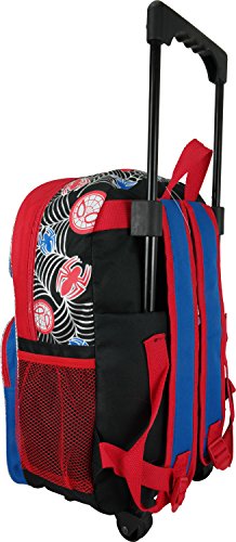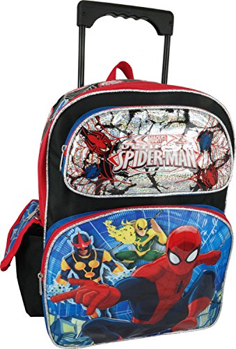 -. Brand : Spiderman -. Color : black blue -. EAN : 0875598657154 -. Feature : Double zippered main compartment. / Two Front pockets with zipper closure. / One side vecro-closure pocket and one side meshed pocket. / Adjustable padded shoulder straps / Measures around : 16"H x 12"W x 5"D -. ProductGroup : Apparel -. ProductTypeName : LAGE -. Title : Marvel Ultimate Spiderman Large 16" Rolling Backpack -. UPC : 875598657154