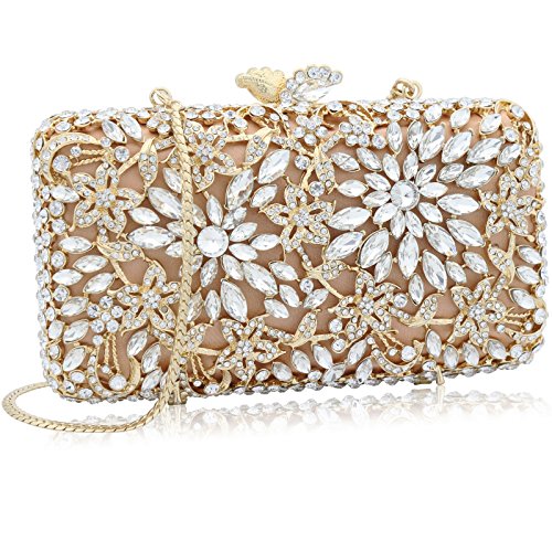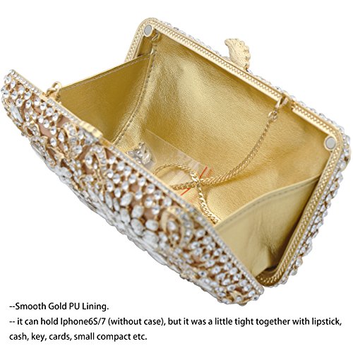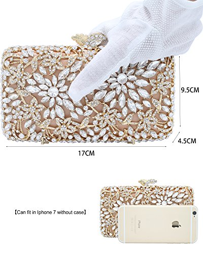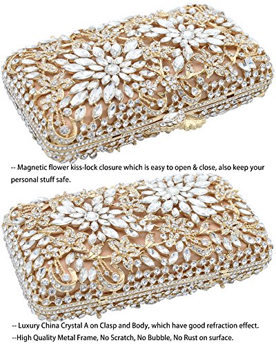 -. Feature : [Material]--Top grade clear rhinestone A which is very dazzling like a diamond or gemstone, no blemishes. K gold plating hardware which was carefully selected, no scratch, no rust on the surface. Nude satin background. Best gold leather lining. / [Chain]--with a detachable luxury brass chain (50cm length). It is sturdy, and you can wear it as shoulder strap, or clutch minaudiere without it. / [Specification]--Size: 17(L)x4.5(W)x9.5(H)cm, Exquisite Size, not too small, it can hold Iphone6S/7, but it was a little tight together with lipstick, cash, key, cards, small compact etc. Weight: 0.57kg. It is made of thin metal, not too heavy, but a little heavier than regular bag. / [Features]--Magnetic flower kiss-lock closure which is easy to open & close, also keep your personal stuff safe. Flower design with cats-eye crystal encrusted, which is the perfect bag to match your charming jewelry, evening shoes and dress. / [Occasions]--cocktail/birthday/prom/wedding party, baby shower, Engagement, Social Activities, nightclub or night out. Great gift for bridal, bridesmaid, wife, mother, female friend etc.