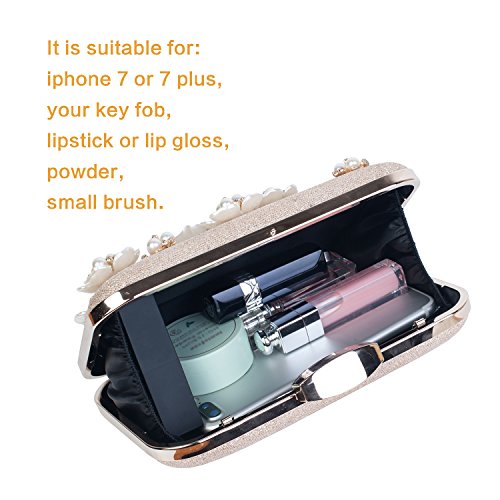 -. Feature : LARGE CAPACITY--Suitable for 7 or 7 Plus, lipstick or lip gloss, mirror, small brush,small bottle of perfume, your key fob. / DIMENSIONS--7.9 x 1.7 x 4.7inches(L x W x H); weight is 0.8LB. Removable chain-strap(long chain is about 47.2inches, short chain is about 14.2inches) for you to choose to shoulder style, crossbody style or tote style / EXQUISITE DESIGN--The entire structure is made of superior metal frame construction. The surface decorated by the variety pearl and flowers which are made of satin and PU, the lining is made from soft satin. The exquisite and elegant style made you 100% attracts lots of admiring glances, which feels soft and comfortable when you take it / OCCASION--Stylish, leisurely design can be used as a daily clutch bag. Exquisite, elegant design can be used as cocktail party, wedding, prom, banquet, evening bag when you take part in special occasion. / EASY TO CLEAN--Which is easy to clean and ordinary waterproof (but please do not soak in the water)