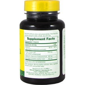 Suggested Use As a dietary supplement take one capsule daily or as directed - Or as directed by your healthcare professional. Supplement FactsServing Size: 1 CapsuleServings Per Container: 60Amount Per Serving% Daily Value***Vitamin E (as d-alpha tocopheryl succinate)50 IU167%Ginkgo Biloba Leaf (8 to 1 extract ginkgoaceae)120 mgCapsicum (Capsicum frutescens fruit)80 mgGotu Kola (Centella asiatica root)80 mg ***Percent Daily Values are based on a 2,000 calorie diet