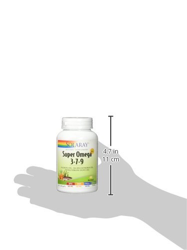 Super Omega 3-7-9 provides a new alternative to standard EFA supplements. Omega 3 EPA and DHA helps offset the dietary overage of Omega 6. Omega 7 to soothe and fortify the internal organs, and Omega 9 for nutritive cardiovascular support. This new blend of oils meets the Solaray Platinum Standard of quality and is tested for identity, purity, and potency. The molecularly distilled Salmon oil, pure Sea Buckthorn Fruit Oil, Extra Virgin Olive Oil, and Vitamin D3 provide the right ratio of Omega Fatty Acids for maximum support.Feature