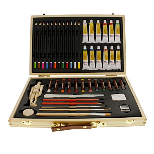 US ART SUPPLY 46-PIECE OIL PAINTING SET WITH, WOOD STORAGE CASE, 12-TUBES OIL PAINTING COLORS, 12 COLORED PENCILS, 12 OIL PASTEL STICKS, 2 GRAPHITE PENCILS, 3 ARTIST BRUSHES, 5.5" MANIKIN, PALETTE KNIVE, ERASER, PENCIL SHARPENER, PLASTIC PALETTE-GREAT STUDENT ARTIST STARTER SET