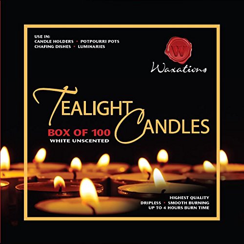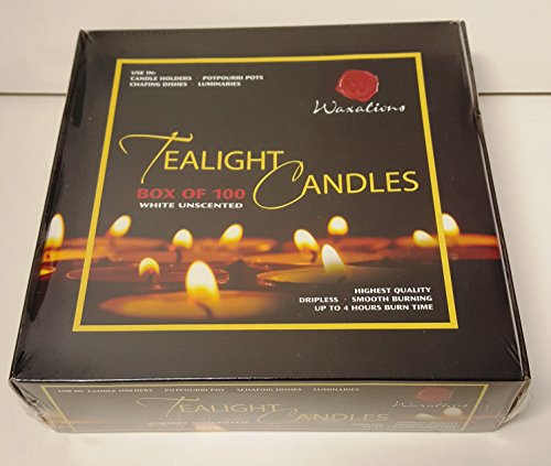 A Boxed Set of 100 Waxations Tealight Candles. The Tealight Candle is a self-contained, versatile little candle. Its efficient and very inexpensive . The Waxations Tealights featured here are compression molded and set in aluminum cups with 100% cotton wicks. Waxations Unscented Tealight Candles are a great value and perfect for weddings, restaurants and parties. They can be used in potpourri burners, food warmers or any standard Glass Tealight Holder. Use them every day. Size: 0.5"(H) x 1.5"(W). Burn time up to 4 hours each. These come in a sturdy box with shrink wrap around the box for additional protection.