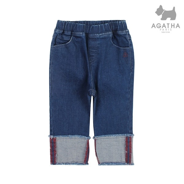 뒷면 배색 단으로 롤업스타일로 포인트를 준 데님팬츠입니다.배색 단 와끼에 오버로크로 컬러 포인트를 주었습니다.