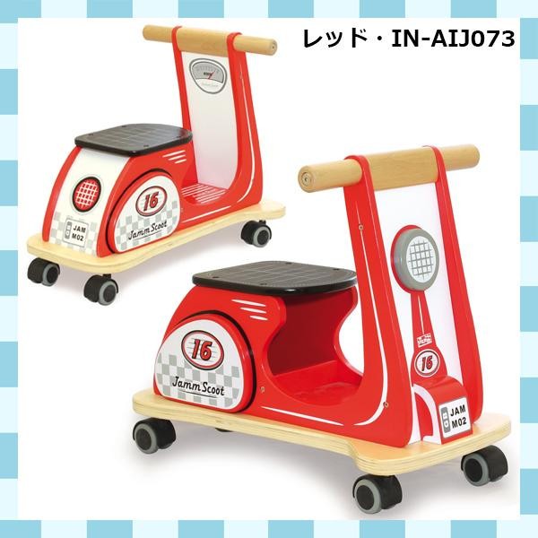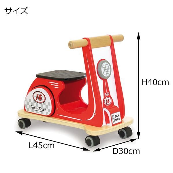 ヨーロッパのおもちゃらしいカラーで、丈夫な作りです。4つの車輪で安定性もバツグン☆ 製造国:企画:イギリス、製造:中国 素材・材質:天然木(ブナ)、合板、MDF、TPR樹脂、TVC 商品サイズ:L45×H40×D30cm 重量:約3500g 仕様:組立品組立時間/人数:約30分/2人対象年齢:1歳以上耐荷重:30kg ※サプライヤー直送品 ご注文後2~3営業日後の出荷となります【商品名】インディゴジャム Jammスクーター レッド・IN-AIJ073