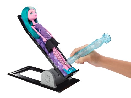 When you’re done “tumbling” pieces, assemble your ghoul on the table and add gore-geous details using a variety of instruments and accessories, including an electronic heat pen, ice tool, makeup applicator, spritzer, beaker, tongs, towel, and wig stand. To change your monster doll’s makeup, simply wipe the applicator (dipped in ice-cold water) over her lips and eyes. Then crank the chamber chair into a stand-up position to do her ’do, too. Mist her hair with ice-cold water from the spray bottle for a dramatic color effect, and then add even more scary-chic details with the chamber tools. Now your monster doll is ready to tear up the town in style. The Color Me Creepy Design Chamber includes one complete doll with a wig and lots of design accessories. To expand the customization fun with additional dolls and fashions, check out the Color Me Creepy Starter Packs and the Color Me Creepy Add-On Packs (each sold separately). Girls will shriek with delight.