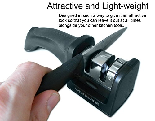 ATTRACTIVE AND LIGHT-WEIGHT - Let's face it, most manual knife sharpeners are ugly and certainly are not the sort of tool you would leave out on the kitchen work surface. However, the Wrenwane kitchen knife sharpener has been designed in such a way to give it an attractive look so that you can leave it out at all times alongside your other kitchen tools. Dimensions 190x60x50 millimeters.