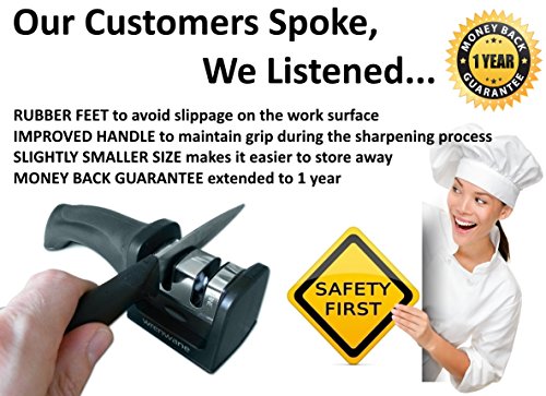 DESIGNED FOR SAFETY - For safety this your number 1 choice. What matters most, it has been designed specifically to protect YOU! Unlike many other devices on the market, the Wrenwane sharpener has a large grip handle that allows you to effortlessly hold the knife sharpener steady during the sharpening process. Additionally, the feet are non-slip so the sharpener will not slide over the work bench either making this device extremely safe to use. Every chef will be happy with this sharpener.