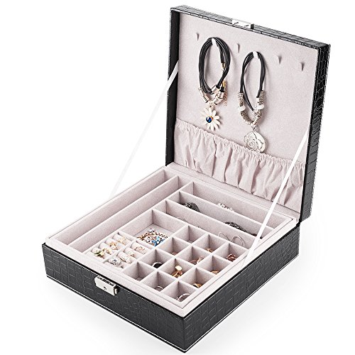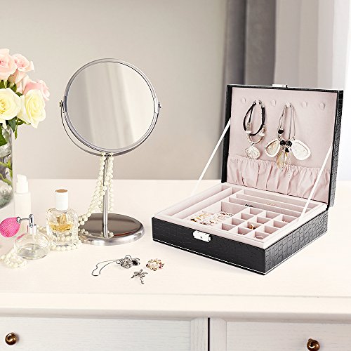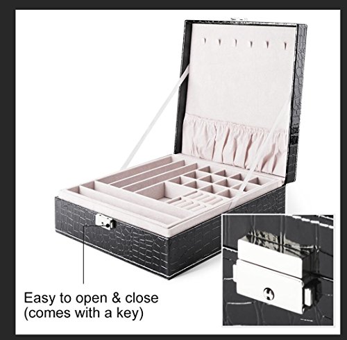 MESHA Jewelry Box 2 Layers Modern Girls Jewelry Organizer for Earring Ring Necklace Bracelet PU Leather Black storage case with Lock