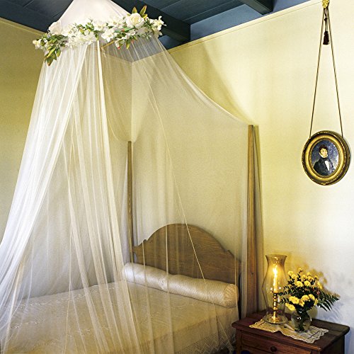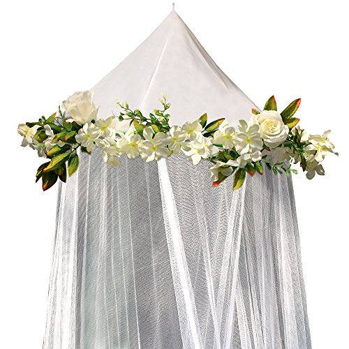 - PREMIUM QUALITY MULTI-USE DESIGNER FLOWER BED CANOPY - Perfect as a Mosquito net, hang it in a bedroom, around a cake table at an event, in a play space, or even as a reading nook. Yards of white mosquito netting fabric flow beautifully from an elegant top surrounded with rose vines.