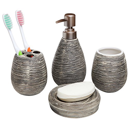 4 Pc Line Textured Dark Brown Ceramic Soap Dish, Soap Dispenser, Toothbrush Holder & Tumbler Bathroom Set