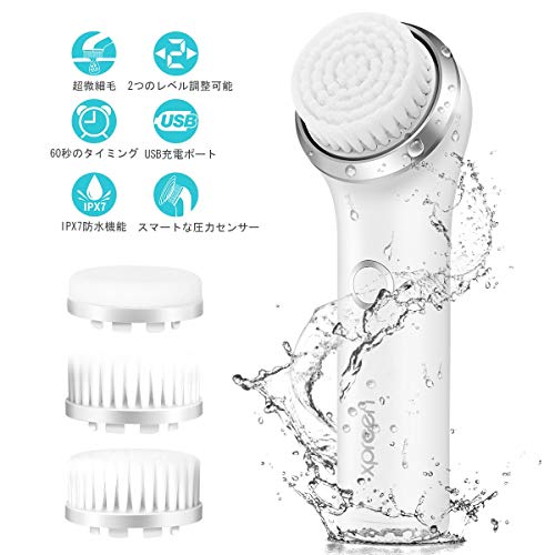 【正規品】xpreen 電動洗顔ブラシ 電動パフ マッサージ洗顔ブラシ USB充電式毛穴クリーン Facial Brush IPX7全身防水機能 2段階スピード・調整可能 にきび・毛穴の汚れ・黒ずみ・角質ケア 毛穴洗浄 お肌にやさしい!美顔器 美肌SPA 洗い上がりすっきり ! 女性用も男性用も (標準ブラシヘッド1個 極細ブラシヘッド1個 パフヘッド1個付き)(ホワイト)