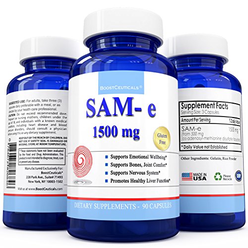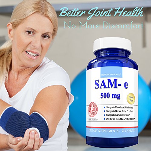 -. Binding : Health and Beauty -. Brand : BoostCeuticals -. EAN : 0784672826846 -. Feature : Sam-e is known to support emotional well-being by promoting a balance of serotonin plus dopamine the brain food for neuro transmission and good mood* / Assists joint support and health by providing maintenance to cartilage therefore slowing the decline which comes with age as well as ongoing physical activity or wear* / Assists to support healthy liver function and detoxification* Please note packaging may vary. / Made in USA in FDA Approved Facility, Gluten Free, Soy Free / Order Now No Risk Boostceuticals 1500mg Daily Sam e Backed By a No Fuss Return Guarantee -. IsAdultProduct : 0 -. Label : BoostCeuticals -. LegalDisclaimer : *This product is not intended to diagnose, treat, cure or prevent any disease. Actual product packaging and materials may contain more and different information than what is shown on our website. We recommend that you do not rely solely on the information presented and that you always read labels, warnings, and directions before using or consuming a product. Please see our full disclaimer below. -. Manufacturer : BoostCeuticals -. ProductGroup : Health and Beauty -. ProductTypeName : HEALTH_PERSONAL_CARE -. Publisher : BoostCeuticals -. Studio : BoostCeuticals -. Title : BoostCeuticals Sam-e 500mg 90 Count Supplement -. UPC : 784672826846