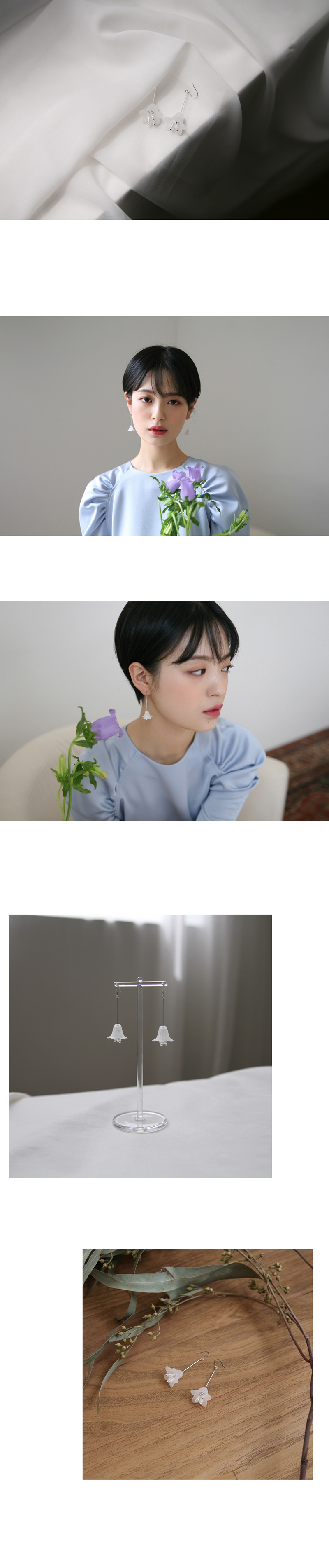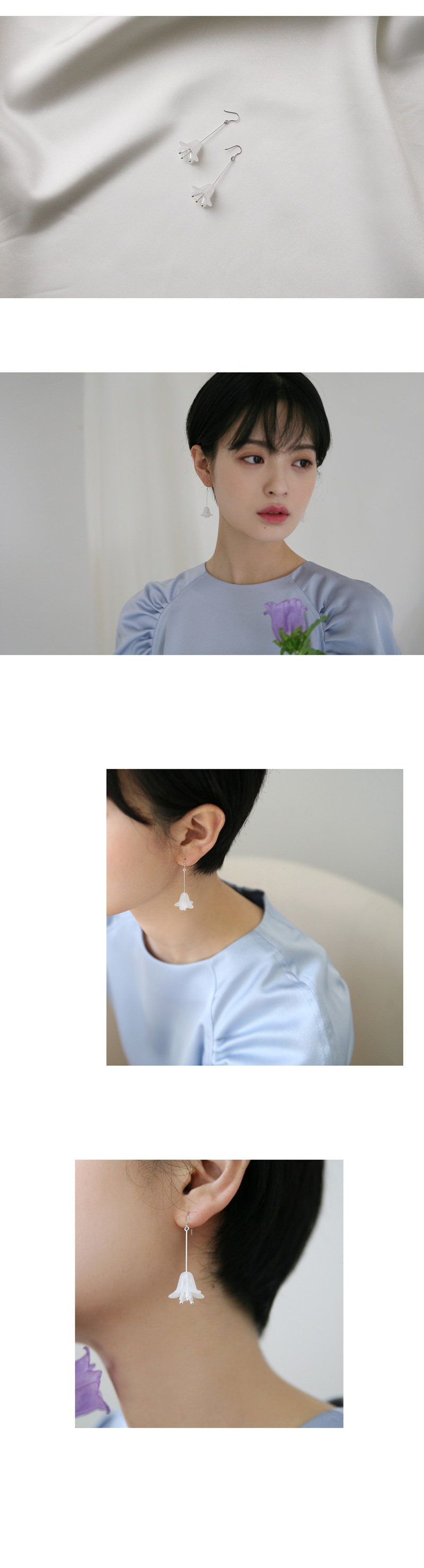 | may lily earrings 은방울꽃을 연상케하는 플라워 드롭 이어링입니다. 크리스탈을 엮은 수술과 퓨어한 화이트톤의 꽃망울로 이루어진 군더더기 없는 디자인으로, 봄·여름 활용도가 높은 아이템입니다. 귀걸이 하나만으로 분위기를 한층 더 화사하게 업 시켜주는 소장가치 높은 제품으로 가벼운 티셔츠나 원피스, 블라우스와 함께 매칭해보기 좋으며 웨딩 촬영 주얼리로도 추천드립니다. 은침으로 제작되었으며, 가벼운 무게감으로 착용감이 편리합니다. SIZE : 총 길이 5cm, 꽃 가로 18mm, 세로 13mm MATERIAL : earpost - silver, plastic glass, crystal |