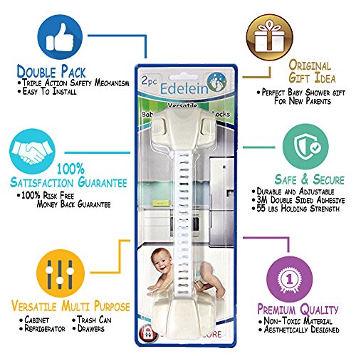 -. Binding : Kitchen -. Brand : Edelein -. Color : white -. EAN : 0712096817232 -. Feature : #1 PARENT APPROVED safety locks successfully designed to handle the problems of curious toddlers and pets. Brand NEW White Extra Strength Lock Design gives a modern look and won't take away from your home decor. / VERSATILE MUST HAVE for Toddler Parents. De-Stress your life, NO MORE clothes toys food and puzzle pieces scattered through your home by Denying access with our safe and secure locks. Works on Cabinet Drawers Refrigerator Toilet Seat Trash Can and other curious places. / SUPER EASY TO INSTALL Newly designed Extra large 3M Adhesive 1st on market, a snap to remove No Drilling great for homeowners and ideal for renters / BEST 2 Pack TOOL. Triple action with dual button release, plus Fully Adjustable Belt cut to desired length with FLEXIBLE corner wrap-around Feature to help create a safer home / NO-HASSLE LIFETIME GUARANTEE baby safety locks by Edelein keeping your baby safe through their first Birthday and beyond. -. IsAutographed : 0 -. Label : Edelein -. Manufacturer : Edelein -. Model : 3191115 -. MPN : 3191115 -. PackageQuantity : 1 -. PartNumber : 3191115 -. ProductGroup : Home -. ProductTypeName : HOME -. Publisher : Edelein -. Studio : Edelein -. Title : Child - Pet - Safety Locks - Smart Solution in Baby Proofing - Safe Secure Versatile - Easy Install No Drilling - Cat - Dog Proof Trash Can - Toilet Seat Lock - Refrigerator Latch & Cabinets -. UPC : 712096817232