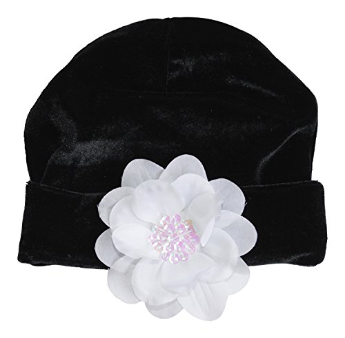 PLH Bows Velvet Beanie with Cotton Lining and Flower (Black/White)