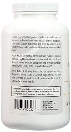 -. Binding : Health and Beauty -. Brand : Jigsaw Health -. EAN : 0876634001382 -. Feature : BEST CALCIUM SUPPLEMENT: Superior absorption and bioavailability. / BORON, VITAMIN D3 and CALCIUM SUPPLEMENT: Contains 1,000 IUs of Vitamin D3, 4 mg of Boron and 1,000mg of Calcium per serving. / TOXIC FREE CALCIUM SUPPLEMENT: Jigsaw Calcium contains no coral calcium or the potentially unhealthy trace minerals cadmium, aluminum, mercury, thallium, uranium, lead and other metals commonly found in coral calcium. / CALCIUM MALATE: We use Albion Lab's calcium malate and our product was awarded Albion Advanced Nutrition's Gold Medallion. / GUARANTEED: In addition to Amazon's 30-day refund policy, we back our products up with a 90-day, 100% money-back guarantee. It's hassle free! You don't even have to send the bottle back... Just call us and we'll give you a full refund, no questions asked. -. IsAdultProduct : 0 -. IsAutographed : 0 -. IsMemorabilia : 0 -. Label : SNT -. Manufacturer : SNT -. MPN : 40015804722 -. PartNumber : 40015804722 -. ProductGroup : Health and Beauty -. ProductTypeName : HEALTH_PERSONAL_CARE -. Publisher : SNT -. Studio : SNT -. Title : Calcium 240ct- The most absorbable and bioavailable (easier for your body to use) form of calcium! -. UPC : 876634001382