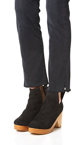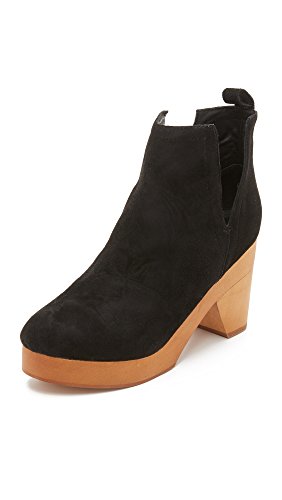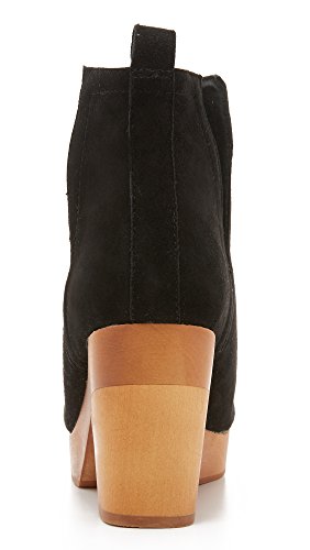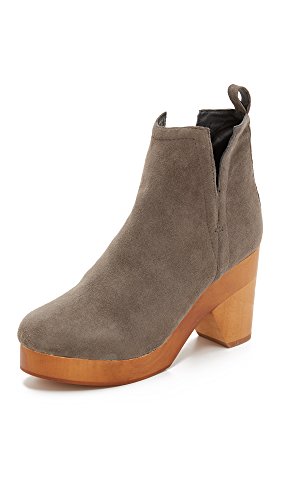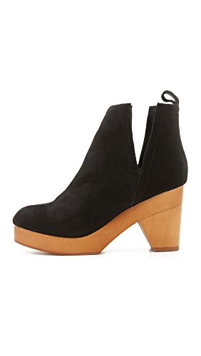 Smooth suede Jeffrey Campbell booties styled with a split shaft. Pull tab at heel. Notched wooden platform. Chunky heel. Rubber sole.