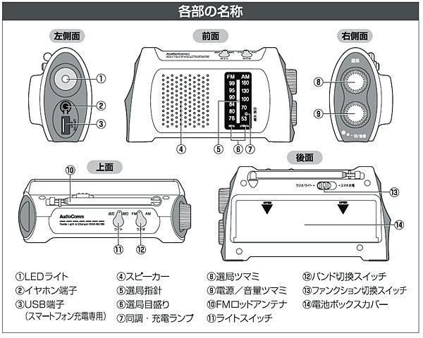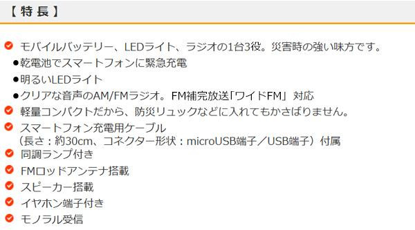 | モバイルバッテリー、LEDライト、ラジオの1台3役!!災害時の強い味方です。軽量コンパクトだから、防災リュックなどに入れてもかさばりません。 |