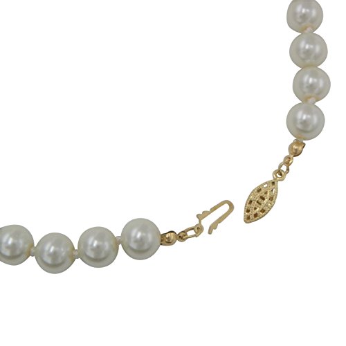 With a gold color, vintage style clasp. Squeeze the clasp ends to pull it out and unhook