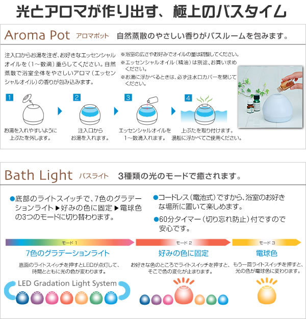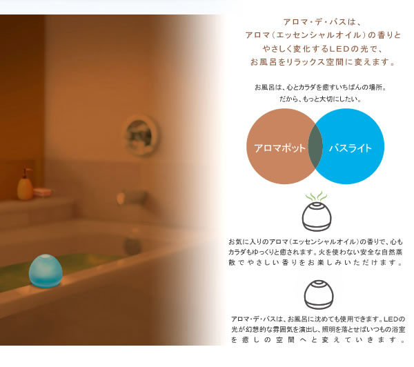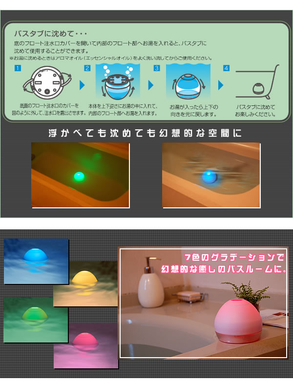 | アロマの香りと、やさしく7色に変化するLEDの光で、お風呂を最高の癒し空間に!だって、お風呂は心とカラダを癒す一番の場所。だからこそ大切にしたい、リラックスしたい・・・そんなアナタの願いを叶えます。お風呂に沈めても使用できるから、さらに幻想的に! |