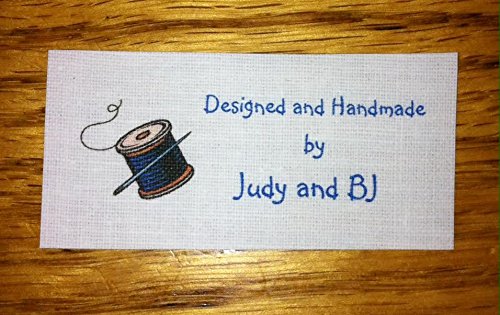-. Title : 40 Custom Sew in Flat sewing Labels with Blue Thread Graphic-made in USA