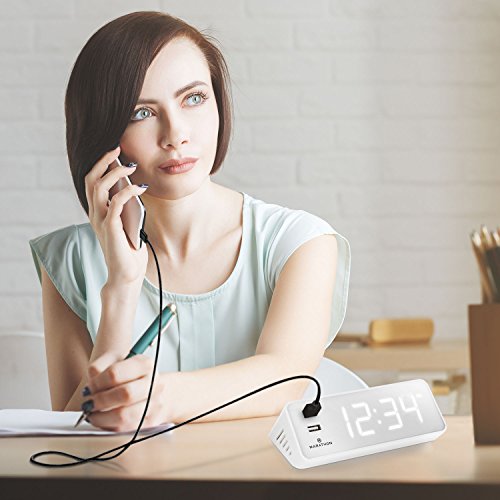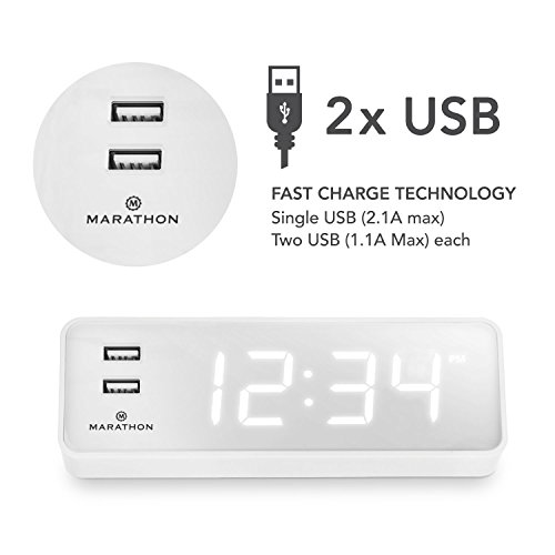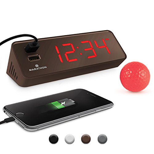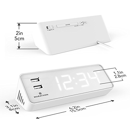 Marathon's LED Alarm Clock & USB Charging Station has many features that make it an excellent addition to your nightstand, work station, kitchen counter or end table. The first thing that separates this clock from the rest are the two, easily accessible USB ports located directly on the front of the clock. These ports are fast charging and are perfect for your phone or tablet. Second, the illuminated digits are bright and easy to read in the dark. If you find them too bright when you are trying to fall asleep there is a dimmer switch to lower the intensity of the illumination, making it appealing to everyone. If it is still too bright, there is a button to turn the display off altogether, without interfering with your charging device. The alarm ON/OFF switch and SNOOZE button are conveniently located on the top so they are easily located in the dark and accessible. Lightweight and compact makes this clock easy to transport. Attractive colours of Snow White, Midnight Black, Cocoa & Graphite Grey are available.Feature