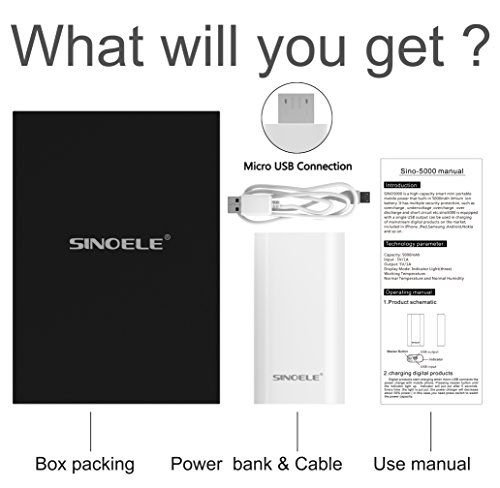 What You Get: SINOELE Portable 5000mAh Power Bank, Micro USB Cable, iPhone6 connector. Welcome Guide, and our fan-favorite 18-month warranty and friendly customer service.