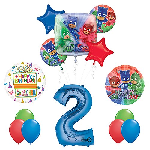 -. Feature : (1) 28" PJ MASKS Jumbo Shape Foil Balloon / (2) 18" round PJ MASKS Foil Balloon, (1) 18" PJ MASKS Happy Birthday Foil Balloon / (1) 34" Giant Blue Number 2 Shape Foil Balloon / (1) 18" Birthday Present Balloon, (2) 19" Star Shape Foil Balloons 1- Red and 1- Blue / (6) 11" Latex Balloons 2- Red, 2- Lime Green and 2- Blue. Anagram foil balloons and Tuf-Tex latex balloons are MADE IN USA...