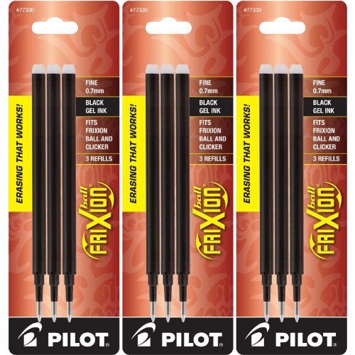 -. Binding : Office Product -. Brand : Pilot -. EAN : 0072838744449 -. Feature : Made to fit Pilot FriXion Ball; FriXion Clicker and FriXion LX pens / Fine point (0.7mm) / 3 premium erasable black gel ink refills per pack - Sold as 3 packs per order / Unique Thermo-Sensitive Gel Ink formula disappears with erasing friction / Extend the life of your favorite Pilot FriXion Erasable pen -. Label : pilot usa -. Manufacturer : pilot usa -. Model : 77330 -. MPN : 77330 -. NumberOfItems : 3 -. PackageQuantity : 9 -. PartNumber : 77330 -. ProductGroup : Office Product -. ProductTypeName : OFFICE_PRODUCTS -. Publisher : pilot usa -. Studio : pilot usa -. Title : Pilot Gel Ink Refills for FriXion Erasable Gel Ink Pen, Fine Point, Black Ink, Pack of 9 (77330) -. UPC : 072838744449