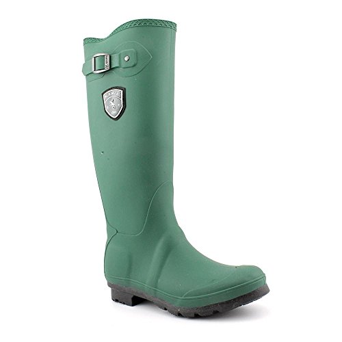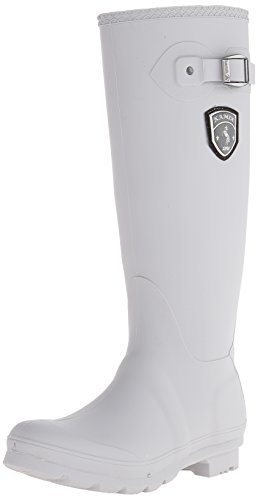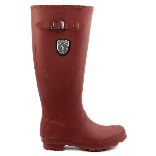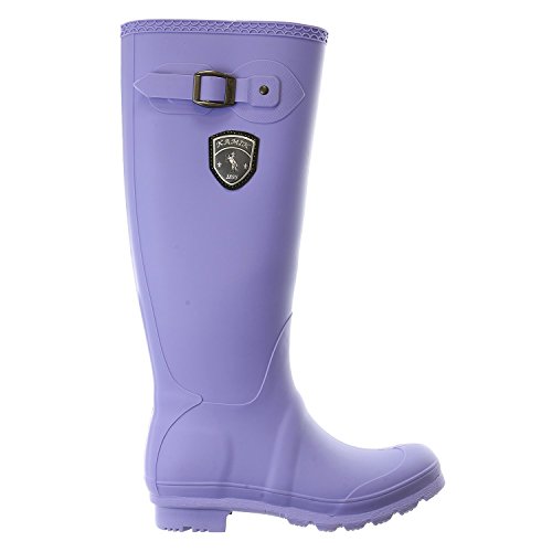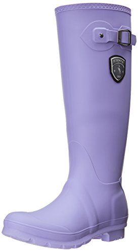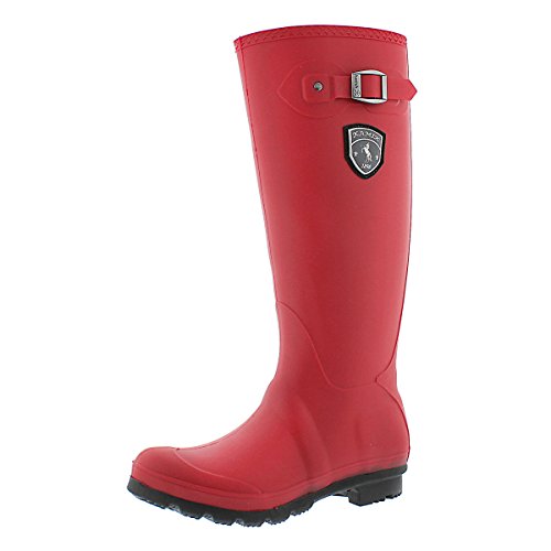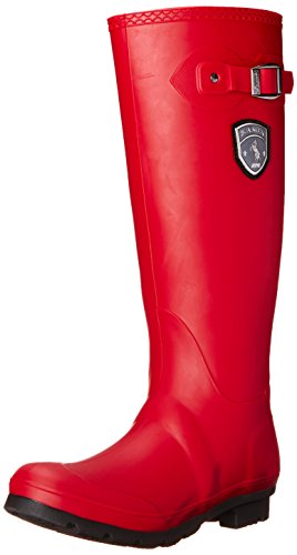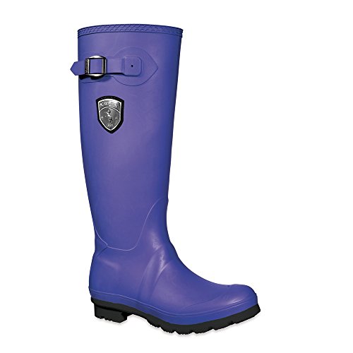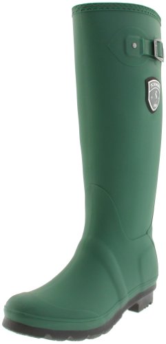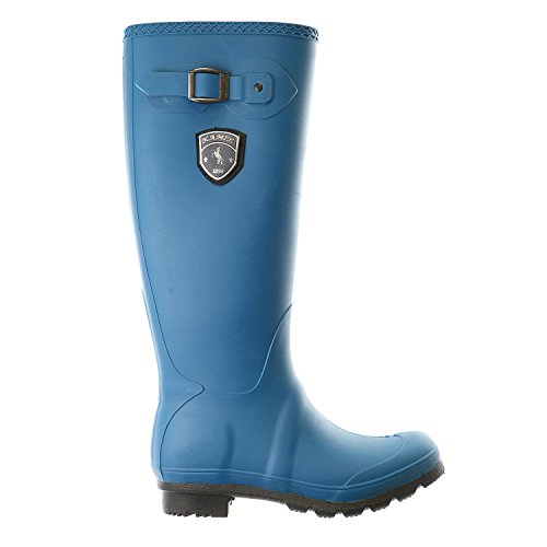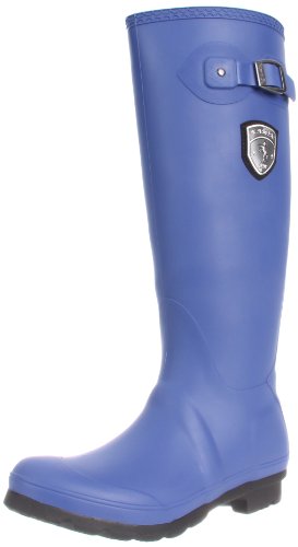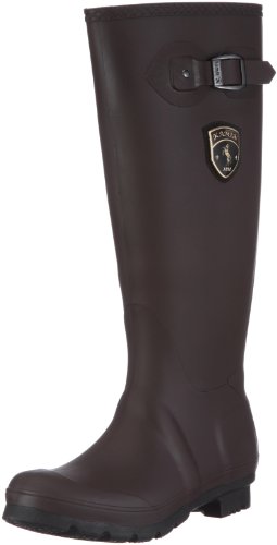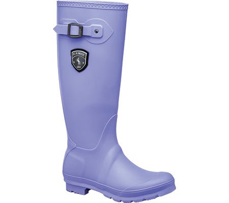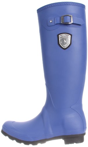 Waterproof mid-calf rain boot with wingtip foot and logoed shield at shaft