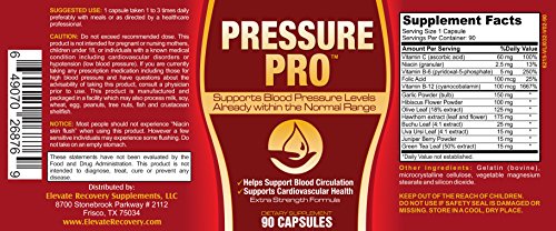 Studio : Elevate Recovery Supplements, LLC Publisher : Elevate Recovery Supplements, LLC Binding : Health and Beauty Product Description Made in The USA with FDA Approved Ingredients in Certified GMP Labs! Maintaining a healthy lifestyle means taking care of your blood-flow/heart and PRESSURE-PRO can play a role in helping you do just that. Made from a unique blend of vitamins and herbal extracts, this blood pressure supplement supports your body by maintaining healthy blood pressure levels. Blood pressure refers to pressure put on the blood vessels when the heart beats and pumps blood into them. As the body ages, vessels lose elasticity and become hardened. Plaque builds up inside, making it harder to circulate blood, so the heart has to push harder, putting added pressure on the blood vessels. If you don't take care of this health problem in a timely manner, it can lead to irreversible consequences. Heart attacks and strokes are among the top three causes of death in America, so it is critical that you do everything you can, including eating right and exercising, to keep your blood pressure stable. Adding all-natural supplements like PRESSURE-PRO to your diet can help your body maintain blood pressure levels within a healthy range. ALL-NATURAL INGREDIENTS: Vitamin C (ascorbic acid), Niacin (granular), Vitamin B-6 (pyridoxal-5-phosphate), Folic Acid, Vitamin B-12 (cyanocobalamin), Garlic Powder (bulb), Hibiscus Flower Powder, Olive Leaf (18% extract), Hawthorn Extract (leaf and flower), Buchu Leaf (4:1 concentrate), Uva Ursi Leaf (4:1 concentrate), Juniper Berry Powder, Green Tea Leaf (50% extract) Blood Pressure Supplement / Blood Pressure Support ?First Time Customers Get 10% OFF 1 Bottle with Coupon Code: 7XLFTGE7 ?Our Promise: Satisfaction Guaranteed or 100% Money Back! ?Ships Fast from Amazon | Made in the USA 0