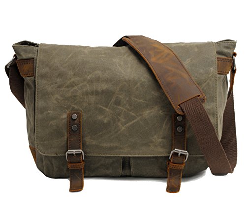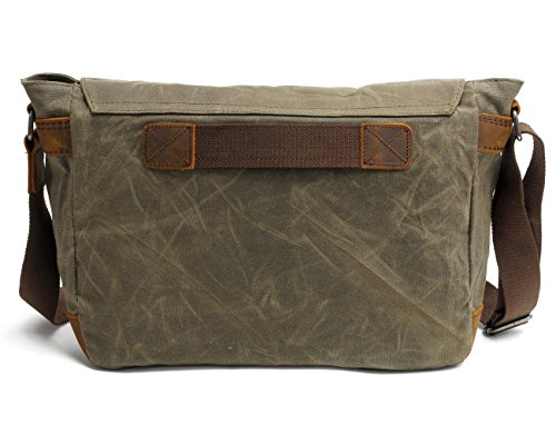 -. Feature : Material: High density waxed canvas / Approx Dimensions: 13.8" L x 10.6" H x 4.3"W, it can hold 13 inch laptop / Carrying handles for this vintage canvas messenger bag made of the same cowhide are fixed by high quality hardware, which makes it comfortable to carry / This is a nice looking, well made bag. It is the retro look, as well as the versatility bag with the magnetic latches / Vintage design, suitable for travel, hiking and everyday using