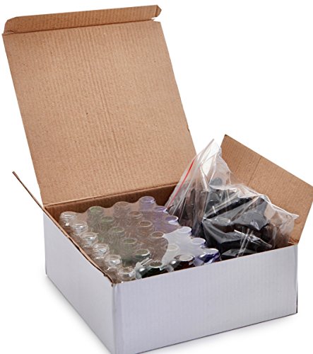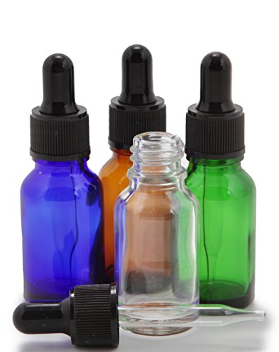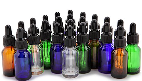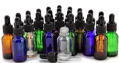 - 24 - 15 ml, Assorted Colors (Clear, Amber, Cobalt Blue, Green) Glass Bottles, with Glass Droppers.