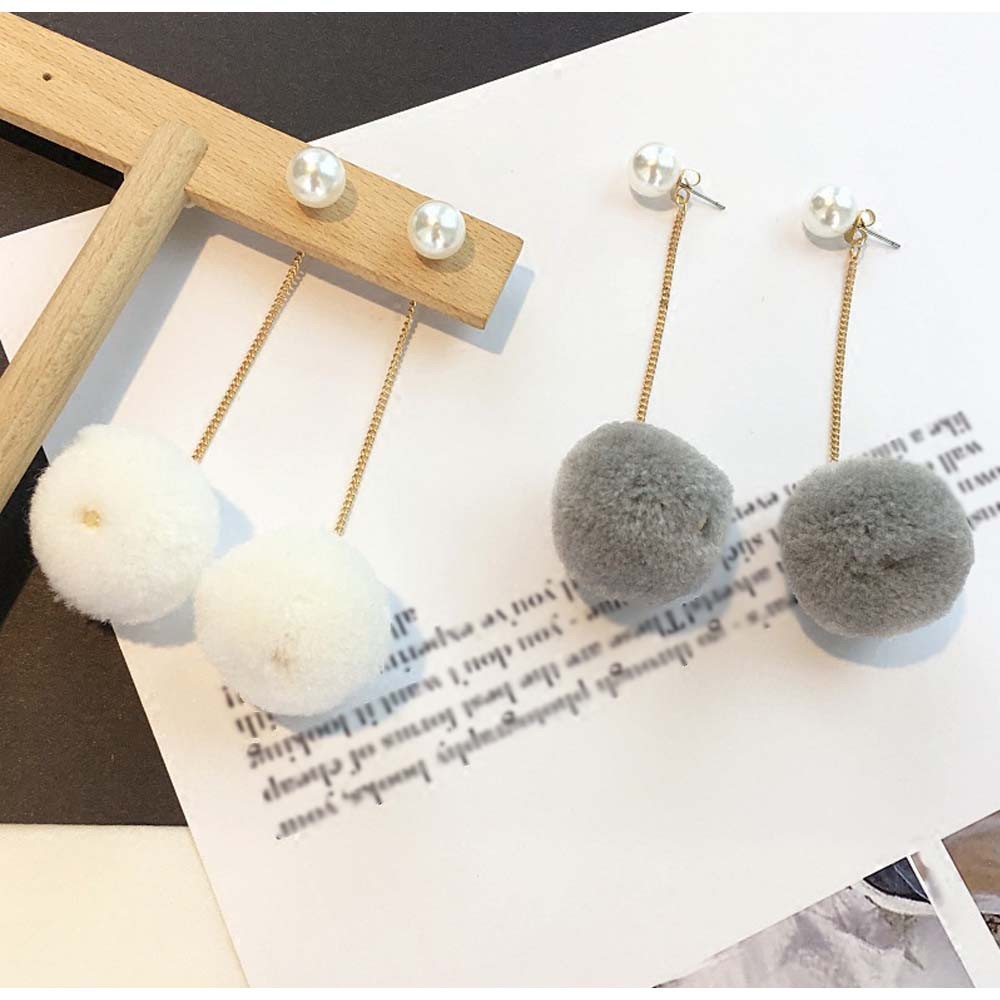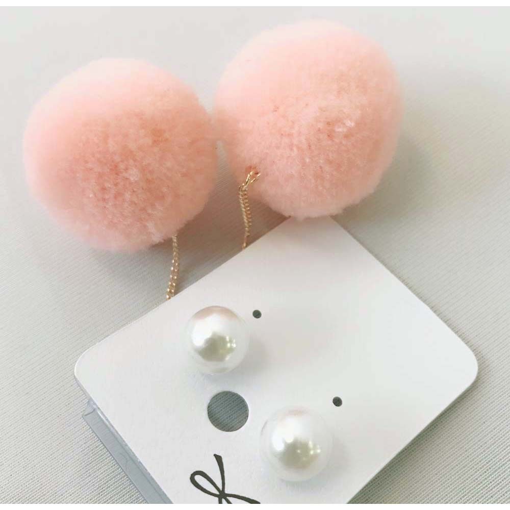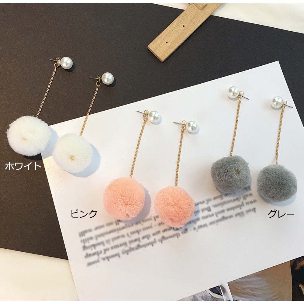 一粒パールにファーぽんぽんが揺れて愛らしいロングピアス
