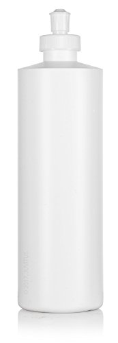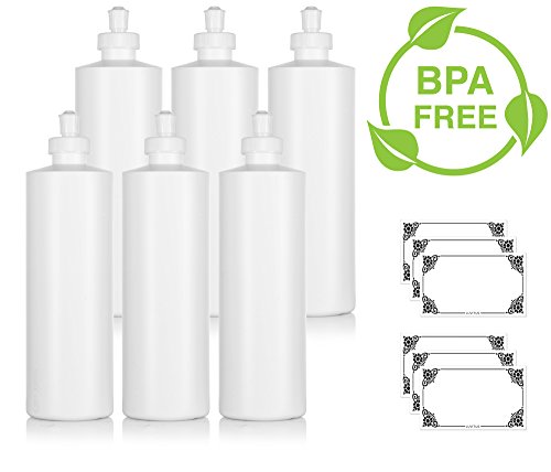 Large White Refillable Plastic Squeeze Bottle with Push Pull Cap Dispenser 16 oz - (6 Pack) + Labels
