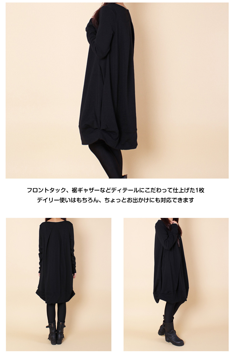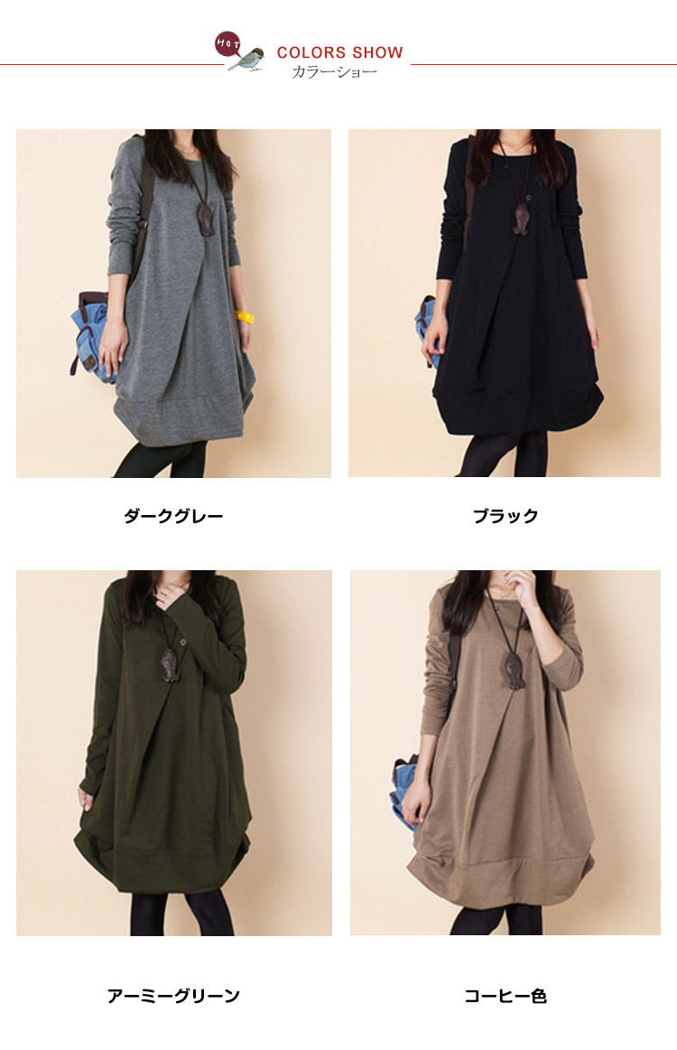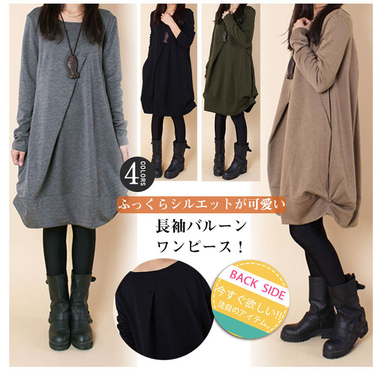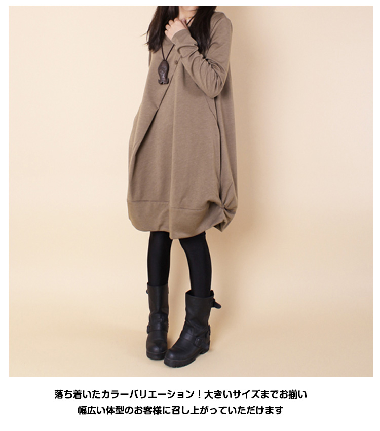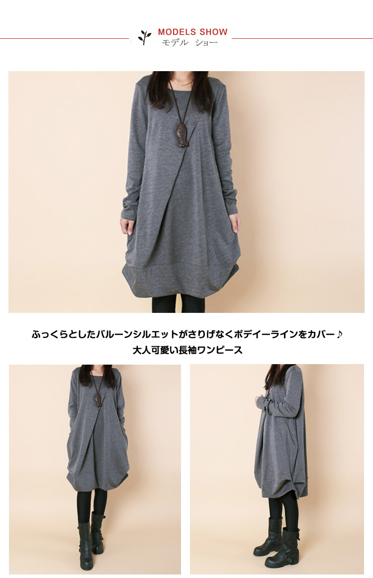 | ふっくらシルエットが可愛い長袖バルーンワンピース!ふっくらとしたバルーンシルエットがさりげなくボデイーラインをカバー♪大人可愛い長袖ワンピース落ち着いたカラーバリエーション!大きいサイズまでお揃い幅広い体型のお客様に召し上がっていただけますフロントタック、裾ギャザーなどディテールにこだわって仕上げた1枚デイリー使いはもちろん、ちょっとお出かけにも対応できます | |