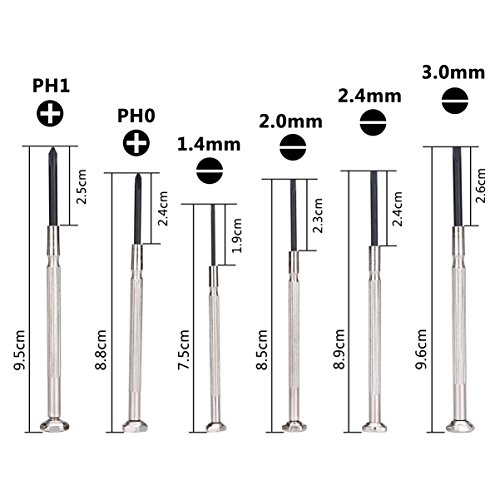 - 6 Different Size / Styles: The precision screwdriver set includes 6 different sizes,2 phillips head screwdrivers(PH1,PH0) and 4 Flat head screwdrivers (3.0 mm, 2.4 mm, 2.0 mm and 1.4 mm).
