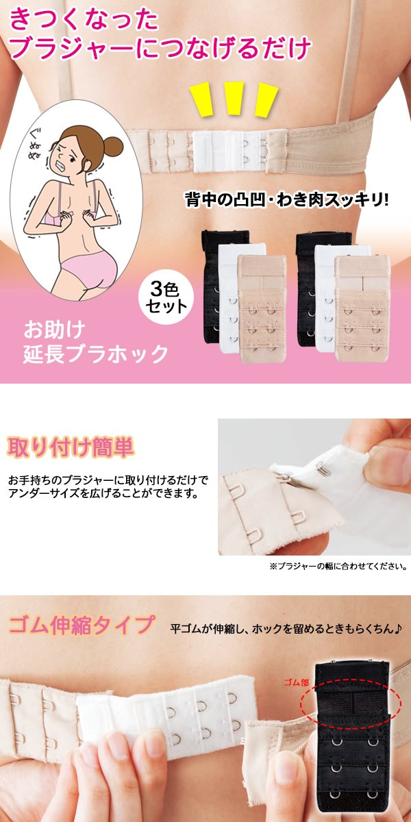 | 使いやすい黒、白、ベージュの3色セット。お使いのブラジャーに繋げるだけで最大6.5cm延長可能。アンダーバストを三段階に調整できます。生地にはゴムを使用しているので楽々フィット。延長ホック/延長フック/ブラホック/ブラフック/アジャスター/調整/調節/アンダーバスト/アンダーサイズ |
