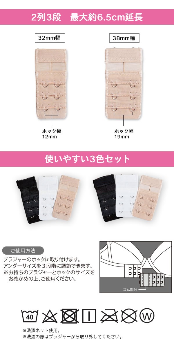 | 使いやすい黒、白、ベージュの3色セット。お使いのブラジャーに繋げるだけで最大6.5cm延長可能。アンダーバストを三段階に調整できます。生地にはゴムを使用しているので楽々フィット。 |