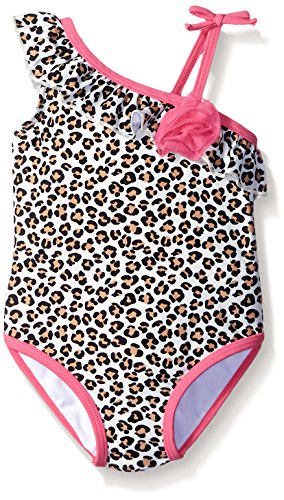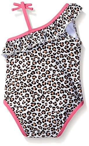 Asymmetrical straps give this leopard-print swimsuit stand-out style at the beach or pool. Baby girls' quick-dry one-piece with ruffle detail and UPF 50+.