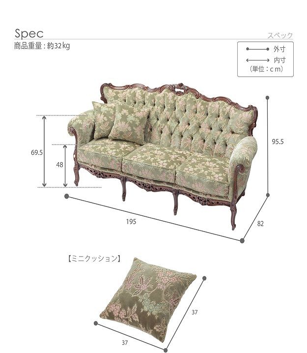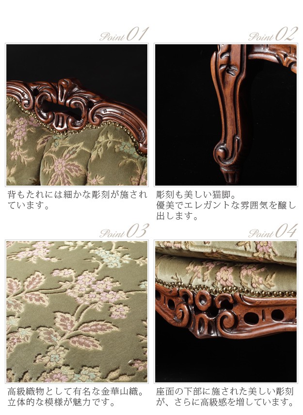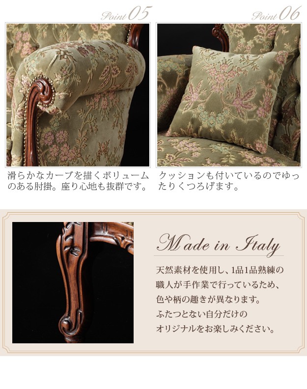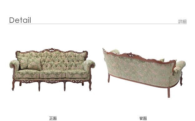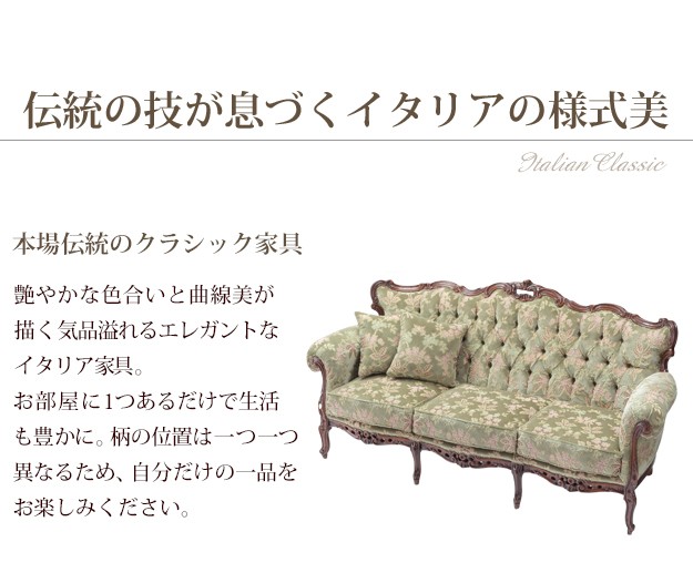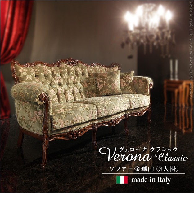 ●商品について:芸術作品ともいえるイタリア直輸入家具をご自宅に☆ヴェローナクラシック金華山ソファ(3人掛け)。立体感のあるしっとりとした質感の金華山織は華やかで高級感があります。フレームに施された彫刻と美しい猫脚も魅力的。滑らかな曲線を描くフォルムと豪華な金華山織がお部屋をエレガントに演出します。ミニクッション2個付き。