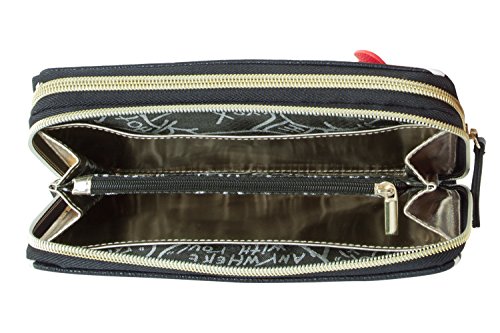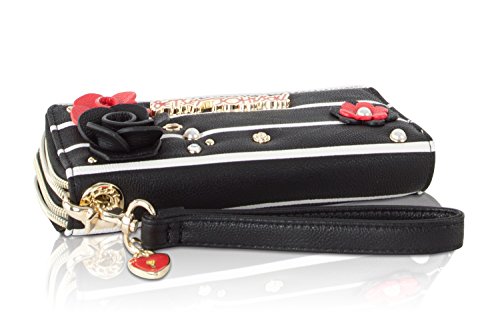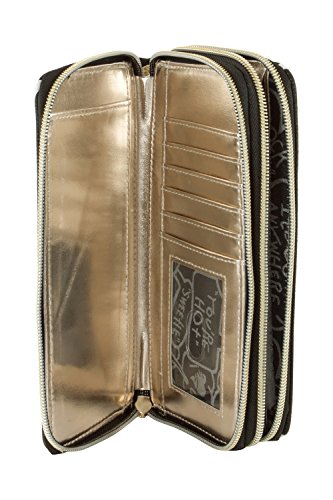 Give any outfit the perfect look with this Betsey Johnson Double Zip Wallet. PVC quilted constructed, logo hardware detail, front zip pocket, removable wrist strap, Zip compartment with 5 cc slots, 4 bill pockets, and ID window, Back zip compartment with 2 bill pockets and center zip divider.
