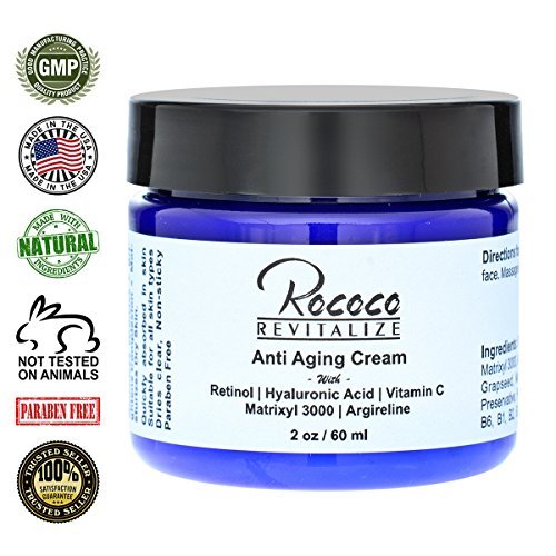 -. Brand : Rococo Revitalize -. Feature : This all in one anti aging cream has Retinol Vitamin A Hyaluronic Acid and Vitamin C Matrixyl 3000 Argireline Peptide / Vitamin c cream in it evens skin tone and brightens complexion while retinol cream which is basically vitamin a cream rejuvenates skin. / hyaluronic acid cream in it hydrates and moisturizes dry skin. / Argireline cream in it along with Matrixyl 3000 makes the best peptide cream that minimizes wrinkles and fine lines. / Best of all the cream is quickly absorbed in skin, dries clear, is non-sticky, suitable for all skin types and is paraben Free. -. IsAdultProduct : 0 -. Label : RococoLife -. Manufacturer : RococoLife -. ProductGroup : Health and Beauty -. ProductTypeName : PERSONAL_CARE_APPLIANCE -. Publisher : RococoLife -. Studio : RococoLife -. Title : Anti Aging Cream with Retinol Vitamin a Hyaluronic Acid and Vitamin C Matrixyl 3000 Argireline Peptide