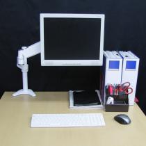 ディスプレイの台座を分離してモニターアームを取り付ける事で、デスクの上を広々と自由に使えるので、作業もはかどる。ディスプレイの下に書類やファイルを収納することもできる。パソコンを使わない時はコンパクトに畳め、デスクはスッキリ使える。フレックスアームで全方向に動くモニターアーム。縦横、遠近、回転など、様々な動きが可能。また、クランプとグロメットの2タイプが選べるので、机の端に取り付け(クランプ)たり、机の穴を利用して取り付け(グロメット)たりできる。天板の厚さが12mm以上55mm以下であれば取り付け可能。