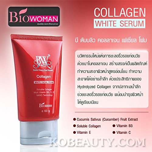 Biowoman BW Collagen Facial Foam 120g. Remove impurities and oiliness on the face purely. With the effectiveness of marine collagen and multivitamins (Vitamin B3, C, E), it moisturizes and softens the skin. Skin looks radiant naturally. ✪ USAGE • Biowoman BW Collagen Facial Foam Foam on palm • Water drops on the foam, slightly rub until foam. • Massage the foam, loop around the face. • Rinse with clean water. ✪ Size: 120 ml. / Tube ✪ Notification No.: 10-1-5913458