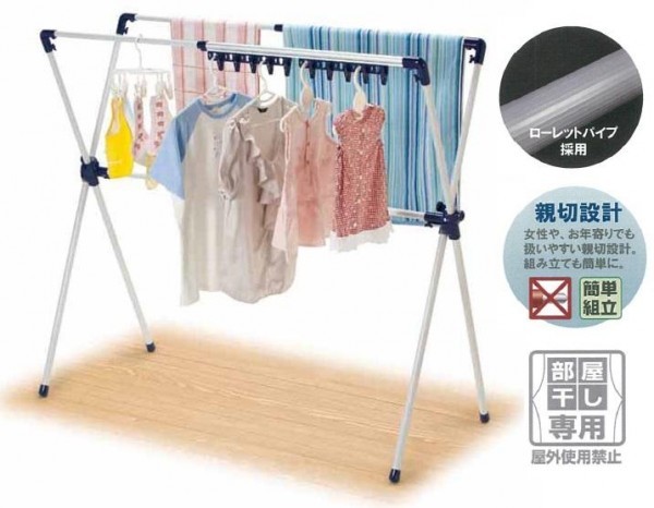 ふとんも干せる大き目サイズ☆部屋干し専用のものほしスタンドです。本体には見た目も美しく丈夫なローレットパイプを採用。使わない時はコンパクトに収納でき、場所を取りません。 |