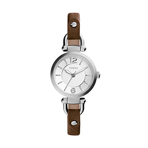 -. Binding : Watch -. Brand : Fossil -. Color : Brown -. Department : womens -. EAN : 0796483182264 -. Feature : Round watch with silver-tone dial featuring equestrian-inspired lugs, polished bezel, and placed indices / 26 mm stainless steel case with mineral dial window / Quartz movement with analog display / Brown calfskin band with buckle closure / Water resistant to 50 m (165 ft): In general, suitable for short periods of recreational swimming, but not diving or snorkeling -. Label : Fossil Watches -. Manufacturer : Fossil Watches -. Model : ES3861 -. MPN : ES3861 -. PackageQuantity : 1 -. PartNumber : ES3861 -. ProductGroup : Watch -. ProductTypeName : WATCH -. Publisher : Fossil Watches -. Studio : Fossil Watches -. Title : Fossil Women's ES3861 Georgia Three-Hand Watch with Dark Brown Leather Band -. UPC : 796483182264