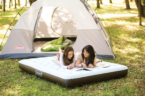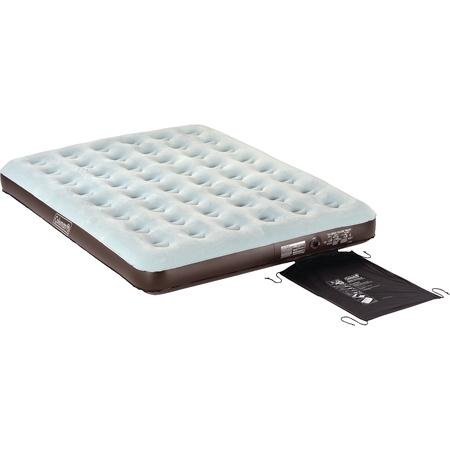 Amazon.com Product Description Whether you need a good camping mattress or an extra bed for guests, the queen-sized Coleman Grand Canyon Quickbed is a great choice. The lightweight bed is custom designed for a good night's sleep, with a 48-coil ComfortSmart coil system and a soft suede top for extra comfort. Comfort is further guaranteed by Coleman's AirTight system, which features a double-lock valve that locks in air twice, ensuring a leak-proof performance through the years. No more waking up on the cold, hard ground after a night of slow air release. And campers who are pressed for time will love the included Coleman 4D pump. The pump, which runs on four D-cell batteries, lets you inflate and deflate the mattress in no time. The Grand Canyon is also extremely durable and easy to store. The mattress is made of Coleman's heavy-duty PVC formula, which is 15 percent more puncture-resistant than the competition. The Grand Canyon's Wrap 'n' Roll construction, meanwhile, makes packing up a breeze: just roll it into the attached carrier, tie it, and transport it. Designed to fit all standard queen-sized sheets, the Grand Canyon measures 78 by 5 by 60 inches (W x H x D).