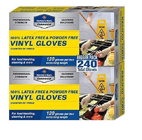 Binding : Misc. Product Description Member's Mark Vinyl disposable gloves are a great all-purpose glove, made with 100% latex free vinyl material and a form fitting size for high levels of dexterity. Safe for food handling and cleaning, Member's Mark vinyl gloves help protect hands from messy jobs. Beaded Cuff Loose fit around forearms makes gloves easier to put on and remove Resists tearing when pulling on or peeling off Prevents binding when flexing hand 0